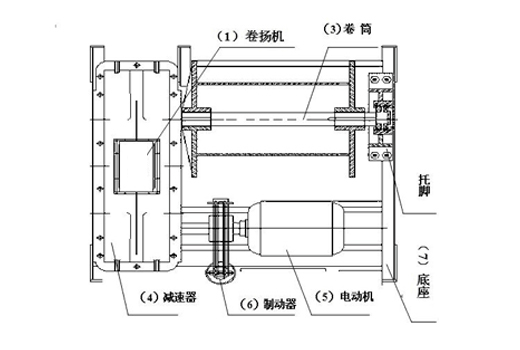 本結(jié)構(gòu)采用行星齒輪傳動方式,通過聯(lián)軸器直接帶動卷筒轉(zhuǎn)動,并可簡易更換報廢鋼絲繩或改變鋼絲繩旋轉(zhuǎn)方向。制動機構(gòu)